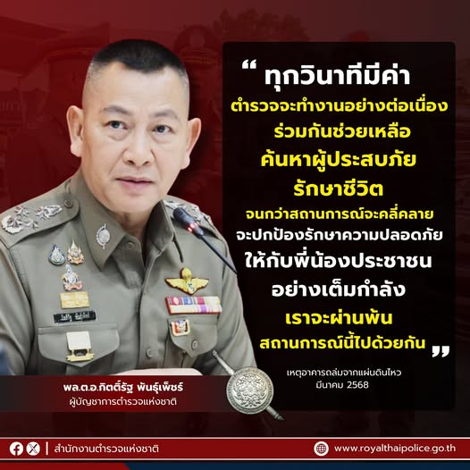 การช่วยเหลือประชาชนทุกวินาทีมีค่า Post author:Maelao @85 Post published:29 March 2568 Post category:ข่าวสารประชาสัมพันธ์ Post comments:0 Comments “ทุกวินาทีมีค่า ตำรวจจะทำงานอย่างต่อเนื่อง ร่วมกันช่วยเหลือค้นหาผู้ประสบภัย รักษาชีวิต จนกว่าสถานการณ์จะคลี่คลาย จะปกป้องรักษาความปลอดภัย ให้กับพี่น้องประชาชน อย่างเต็มกำลัง เราจะผ่านพ้น สถานการณ์นี้ไปด้วยกัน”พล.ต.อ.กิตติ์รัฐ พันธุ์เพ็ชร์ผู้บัญชาการตำรวจแห่งชาติ Facebook Post Views: 0 FacebookFacebookXXLINELine You Might Also Like วันที่ 20 กุมภาพันธ์ 2569 รับการตรวจสอบการฝึก 23 February 2569 กิจกรรมวันเด็ก 10 January 2568 โครงการ สร้างเครือข่ายการมีส่วนร่วมของประชาชน 20 February 2568 Leave a Reply Cancel replyCommentEnter your name or username to comment Enter your email address to comment Enter your website URL (optional) Save my name, email, and website in this browser for the next time I comment.