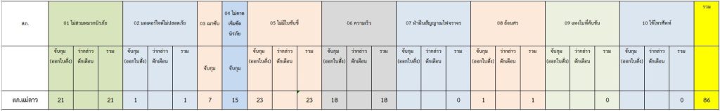 งานจราจร กวดขันวินัยการจราจร ป้องกันและลดอุบัติเหตุทางถนน เทศกาลสงกรานต์ 69 Post author:Maelao @85 Post published:12 April 2569 Post category:ข่าวสารประชาสัมพันธ์ Post comments:0 Comments วันศุกร์ที่ 11 เมษายน 2569 เจ้าหน้าที่งานจราจรสถานีตำรวจภูธรแม่ลาว ได้กวดขันวินัยการจราจรเพื่อป้องกันและลดอุบัติเหตุทางถนน ในห้วงเทศกาลสงกรานต์ 2569 จับกุม 1) ข้อหา เมาขับ จำนวน 7 ราย 2) ไม่สวมหมวกนิรภัย จำนวน 21 ราย 3) ขับรถเร็ว จำนวน 18 ราย Post Views: 0 FacebookFacebookXXLINELine You Might Also Like ผกก.สภ.แม่ลาว ประชุมเร่งรัดคดี พยามยามฆ่า 23 February 2569 สำนักงานตำรวจแห่งชาติชี้แจง หลังพบการแชร์ข้อมูลในสื่อออนไลน์ที่คลาดเคลื่อน ทำให้เกิดความเข้าใจผิดเกี่ยวกับประเภท ชนิด และสีของเครื่องแบบราชการตำรวจ 20 March 2569 โครงการ สร้างเครือข่ายการมีส่วนร่วมของประชาชน 20 February 2568 Leave a Reply Cancel replyCommentEnter your name or username to comment Enter your email address to comment Enter your website URL (optional) Save my name, email, and website in this browser for the next time I comment.