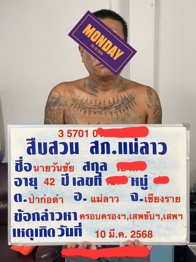 จับกุม พ.ร.บ.ยาเสพติด Post author:Maelao @85 Post published:11 March 2568 Post category:ข่าวสารประชาสัมพันธ์ Post comments:0 Comments วันจันทร์ที่ 10 มีนาคม 2568 พ.ต.อ.สุรกานต์ มุดซาเคน ผกก.สภ.แม่ลาว , พ.ต.ท.สุภาพ จันทะเวียง รองผกก.สส.ฯ มอบหมายให้ พ.ต.ท.ปาริชาติ ศรีโคตร สว.สส.ฯ พร้อมด้วยเจ้าหน้าที่ฝ่ายสืบสวน จับ กุม พ.ร.บ.ยาเสพติด จำนวน 2 ราย ผู้ต้องหา 2 คน ข้อหา มียาเสพติดให้โทษประเภท 1 (ยาบ้า ) ไว้ในครอบครองโดยไม่ได้รับอนุญาต ของกลางยาบ้า รวม 6 เม็ด Facebook Post Views: 0 FacebookFacebookXXLINELine You Might Also Like ซีรี่ย์ แนวตั้ง กับดัก มิจฉาชีพ 19 January 2569 “1 ยึดมั่น 6 เร่งรัด 9 ก้าวหน้า” 3 October 2568 ประชาสัมพันธ์การจราจร เทศกาลปีใหม่ 2569 8 December 2568 Leave a Reply Cancel replyCommentEnter your name or username to comment Enter your email address to comment Enter your website URL (optional) Save my name, email, and website in this browser for the next time I comment.