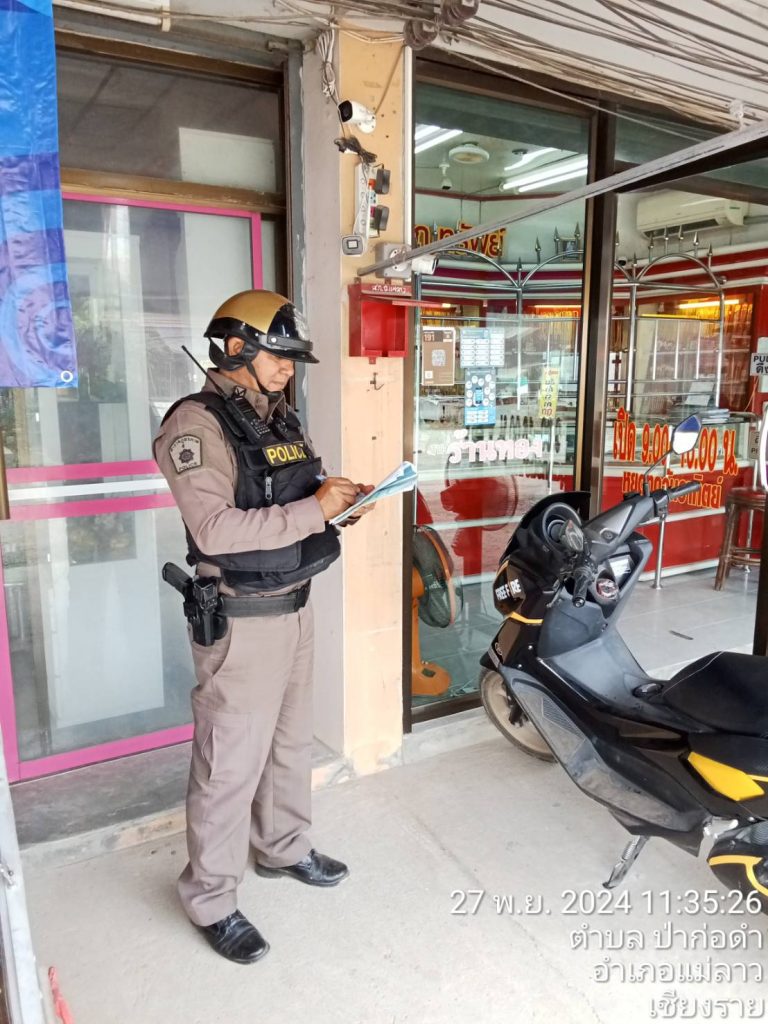 ตรวจตรารักษาความปลอดภัยในพื้นที่ Post author:Maelao @85 Post published:28 November 2567 Post category:ข่าวสารประชาสัมพันธ์ Post comments:0 Comments วันที่ 27 พฤศจิกายน 2567 ด.ต.สมศักดิ์ สีละสิงห์สุวรรณ สายตรวจรถจักรยานยนต์ ผลัดเวลา 08.00 - 20. 00 น. ออกตรวจตรารักษาความปลอดภัยในพื้นที่รับผิดชอบ Post Views: 0 FacebookFacebookXXLINELine You Might Also Like กิจกรรมจิตอาสา วันที่ 25 พฤศจิกายน 2567 25 November 2567 ปราบปราม บุหรี่ไฟฟ้า 27 February 2568 ตร.สภ.แม่ลาว ช่วยเหลือประชาชน 5 February 2569 Leave a Reply Cancel replyCommentEnter your name or username to comment Enter your email address to comment Enter your website URL (optional) Save my name, email, and website in this browser for the next time I comment.