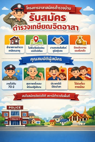 ประชาสัมพันธ์ โครงการ ตำรวจเกษียณจิตอาสา Post author:Maelao @85 Post published:6 February 2569 Post category:ข่าวสารประชาสัมพันธ์ Post comments:0 Comments สถานีตำรวจภูธรแม่ลาว ประชาสัมพันธ์ รับสมัครข้าราชการตำรวจเกษียณจิตอาสา เพื่อสนับสนุน ภารกิจสำนักงานตำรวจแห่งชาติ ในการดูแลรักษาความสงบเรียบร้อยและป้องกันอาชญากรรม ไม่จำกัดจำนวน สนใจติดต่อ รับเอกสารและรายละเอียดได้ที่สถานีตำรวจภูธรแม่ลาว โทร 053-778-191 Post Views: 0 FacebookFacebookXXLINELine You Might Also Like กิจกรรมอาสาพัฒนา วันที่ 2 เมษายน 2568 2 April 2568 การกระทำผิดเกี่ยวกับการเลือกตั้ง การนับคะแนน และการประกาศผลการเลือกตั้ง 20 January 2569 กิจกรรมจิตอาสา วันที่ 25 พฤศจิกายน 2567 25 November 2567 Leave a Reply Cancel replyCommentEnter your name or username to comment Enter your email address to comment Enter your website URL (optional) Save my name, email, and website in this browser for the next time I comment.