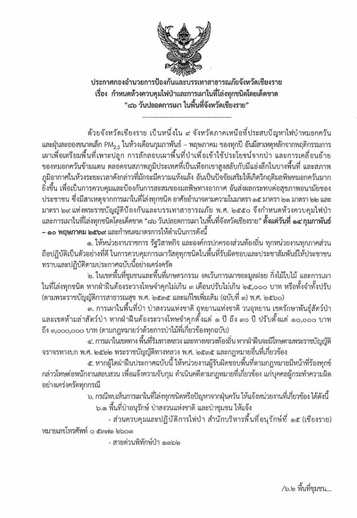 ประชาสัมพันธ์ 86 วัน ปลอดการเผาในพื้นที่จังหวัดเชียงราย Post author:Maelao @85 Post published:23 February 2569 Post category:ข่าวสารประชาสัมพันธ์ Post comments:0 Comments ประกาศกองอำนวยการป้องกันและ สาธารณภัยจังหวัดเชียงราย เร่ือง กำหนดห้วงควบคุมไฟป่า และการเผา ในที่โล่ง ทุกชนิด โดยเด็ดขาด 86 วัน ปลอดการเผา ในพื้นที่จังหวัดเชียงราย Post Views: 1 FacebookFacebookXXLINELine You Might Also Like ปราบปราม บุหรี่ไฟฟ้า 27 February 2568 ดำเนินการโครงการชุมชนยั่งยืน บ้านหัวโล๊ะ 10 March 2568 จับกุมปล่อยเงินกู้ 26 February 2568 Leave a Reply Cancel replyCommentEnter your name or username to comment Enter your email address to comment Enter your website URL (optional) Save my name, email, and website in this browser for the next time I comment.