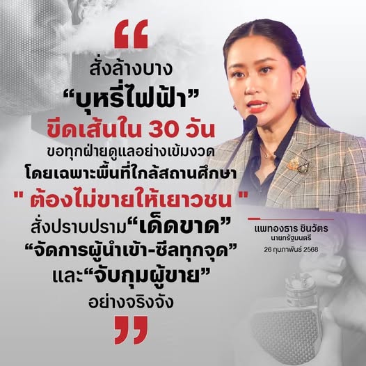 ปราบปราม บุหรี่ไฟฟ้า Post author:Maelao @85 Post published:27 February 2568 Post category:ข่าวสารประชาสัมพันธ์ Post comments:0 Comments นางสาวแพทองธาร ชินวัตร นายกรัฐมนตรี สั่งล้างบาง "บุหรี่ไฟฟ้า" ขีดเส้นใน 30 วัน ขอทุกฝ่ายดูแลอย่างเข้มงวด โดยเฉพาะพื้นที่ใกล้สถานศึกษา "ต้องไม่ขายให้เยาวชน" สั่งปราบปราม "เด็ดขาด" "จัดการผู้นำเข้า-ซีลทุกจุด" และ"จับกุมผู้ขาย" อย่างจริงจัง Facebook Post Views: 0 FacebookFacebookXXLINELine You Might Also Like 5 เช็ก ก่อนเดินทาง สงกรานต์ 10 April 2568 ประชาสัมพันธ์ฝากบ้าน 4 January 2568 แอปพลิเคชัน “Police Care” ตำรวจห่วงใยประชาชน 27 December 2568 Leave a Reply Cancel replyCommentEnter your name or username to comment Enter your email address to comment Enter your website URL (optional) Save my name, email, and website in this browser for the next time I comment.