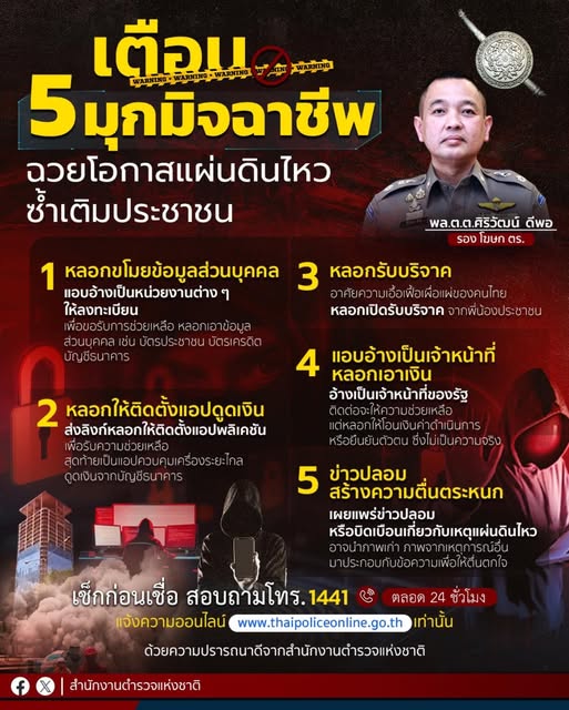 เตือนภัย 5 มุก มิจฉาชีพ แผ่นดินไหว Post author:Maelao @85 Post published:31 March 2568 Post category:ข่าวสารประชาสัมพันธ์ Post comments:0 Comments สำนักงานตำรวจแห่งชาติ เตือน 5 มุกมิจฯ ฉวยโอกาสแผ่นดินไหว ซ้ำเติมประชาชน . พล.ต.ต.ศิริวัฒน์ ดีพอ รองโฆษกสำนักงานตำรวจแห่งชาติ กล่าวว่า สืบเนื่องจากเหตุการณ์แผ่นดินไหวในประเทศเมียนมา เมื่อวันที่ 28 มีนาคม 2568 พล.ต.อ.กิตติ์รัฐ พันธ์ุเพ็ชร์ ผู้บัญชาการตำรวจแห่งชาติ ได้มีความห่วงใยพี่น้องประชาชนที่อาจได้รับความเสียหายจากมิจฉาชีพที่อาจฉวยโอกาสที่พี่น้องประชาชนได้รับความเดือนร้อนจากเหตุแผ่นดินไหว มาเป็นเครื่องมือในการหลอกลวงพี่น้องประชาชน . สำนักงานตำรวจแห่งชาติจึงขอเตือนให้พี่น้องประชาชนทราบถึง 5 มุกมิจฉาชีพ หลอกลวงประชาชน หลังเกิดแผ่นดินไหว ดังนี้ ⛔️1. หลอกขโมยข้อมูลส่วนบุคคล - แอบอ้างเป็นหน่วยงานต่าง ๆ ให้ลงทะเบียนเพื่อขอรับการช่วยเหลือ หลอกเอาข้อมูลส่วนบุคคล เช่น บัตรประชาชน บัตรเครดิต บัญชีธนาคาร ⛔️2. หลอกให้ติดตั้งแอปพลิเคชันดูดเงิน - ส่งลิงก์หลอกให้ติดตั้งแอปพลิเคชันเพื่อรับความช่วยเหลือ สุดท้ายเป็นแอปพลิเคชันควบคุมเครื่องระยะไกล ดูดเงินจากบัญชีธนาคาร ⛔️3. หลอกรับบริจาค - อาศัยความเอื้อเฟื้อเผื่อแผ่ของคนไทย หลอกเปิดรับบริจาคจากพี่น้องประชาชน ⛔️4. แอบอ้างเป็นเจ้าหน้าที่ หลอกเอาเงิน - อ้างเป็นเจ้าหน้าที่ของรัฐ ติดต่อมาว่าจะให้ความช่วยเหลือ แต่หลอกให้โอนเงินมาเป็นค่าดำเนินการ หรือยืนยันตัวตน ซึ่งไม่เป็นความจริง ⛔️5. ข่าวปลอม สร้างความตื่นตระหนก - เผยแพร่ข่าวปลอมหรือบิดเบือนเกี่ยวกับเหตุแผ่นดินไหว โดยอาจมีการนำภาพเก่า ภาพจากเหตุการณ์อื่น มาประกอบกับข้อความเพื่อให้คนตื่นตกใจ ⚠️ขอให้พี่น้องประชาชนระมัดระวังในการส่งต่อข้อมูลข่าวสาร และขอให้ตรวจสอบก่อนว่าเป็นข้อมูลที่ถูกต้อง ก่อนที่จะส่งต่อ หรือกรอกข้อมูลส่วนบุคคล หากพี่น้องประชาชนพบเห็น หรือได้รับความเสียหายจากการหลอกลวงของมิจฉาชีพ สามารถแจ้งความร้องทุกข์ได้ที่ศูนย์รับแจ้งความออนไลน์ บนเว็บไซต์ www.thaipoliceonline.go.th หรือสายด่วน 1441 ได้ตลอด 24 ชั่วโมง Facebook Post Views: 0 FacebookFacebookXXLINELine You Might Also Like ประชาสัมพันธ์ โครงการ ตำรวจเกษียณจิตอาสา 6 February 2569 ประชาสัมพันธ์ ช่วง ห้ามเผาเด็ดขาด 1 March 2568 ประชุมชี้แจงภารกิจ รักษาความปลอดภัยและอำนวยความสะดวกเทศกาล 24 December 2568 Leave a Reply Cancel replyCommentEnter your name or username to comment Enter your email address to comment Enter your website URL (optional) Save my name, email, and website in this browser for the next time I comment.