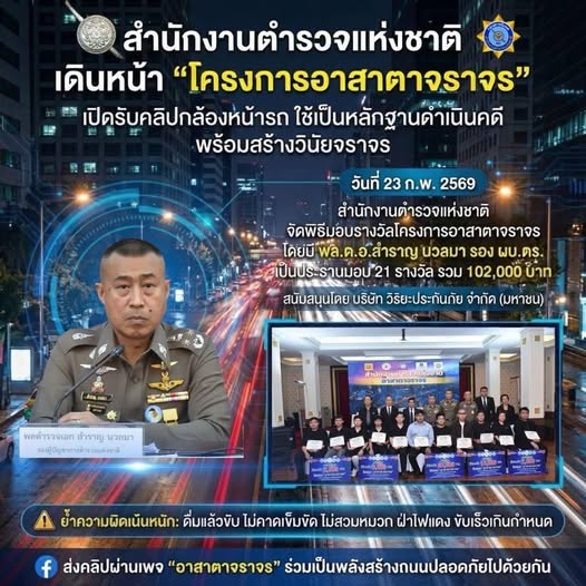 โครงการ “อาสาตาจราจร” ช่วยคนดีชี้คนผิด เป็นส่วนหนึ่งในการลดอุบัติเหตุทางถนน Post author:Maelao @85 Post published:31 March 2569 Post category:ข่าวสารประชาสัมพันธ์ Post comments:0 Comments โครงการอาสาตาจราจร สำนักงานตำรวจแห่งชาติ พร้อมภาคีเครือข่าย เชิญชวนประชาชนส่งคลิปร่วมโครงการ “อาสาตาจราจร” ช่วยคนดีชี้คนผิด เป็นส่วนหนึ่งในการลดอุบัติเหตุทางถนน ส่งคลิปกล้องหน้ารถ ช่วยคนดีชี้คนผิด ได้ที่แบบฟอร์มนี้ https://forms.gle/3A5jSA97ex1Ym3yh8 Post Views: 0 FacebookFacebookXXLINELine You Might Also Like กิจกรรมจิตอาสา 22 ตุลาคม 2568 22 October 2568 ประชุมบริหารเดือน พฤศจิกายน 2567 20 November 2567 สำนักงานตำรวจแห่งชาติย้ำสิ้นสุดมาตรการผ่อนปรน “เตือนก่อนปรับ” 31 มีนาคม 2569 26 March 2569 Leave a Reply Cancel replyCommentEnter your name or username to comment Enter your email address to comment Enter your website URL (optional) Save my name, email, and website in this browser for the next time I comment.