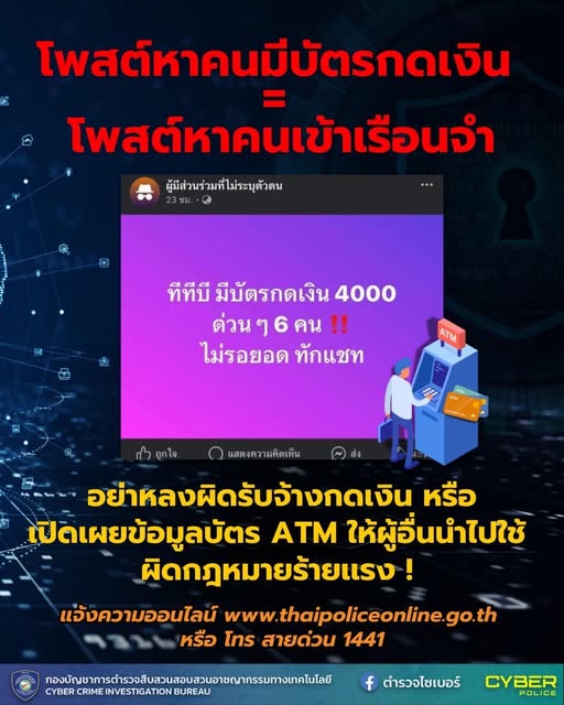 ปัจจุบัน มิจฉาชีพเริ่มเปลี่ยนเป้าหมายจากการจ้างเปิดบัญชีธนาคาร (บัญชีม้า) มาสู่ บัตร ATM มากขึ้น #อย่าหลงเชื่อ รับจ้างกดเงิน หรือเปิดเผยข้อมูลบัตร ATM ให้ผู้อื่นนำไปใช้ในการกระทำความผิด ซึ่งทำให้เรากลายเป็นผู้กระทำความผิด รับโทษทางกฎหมายโทษทางกฎหมาย