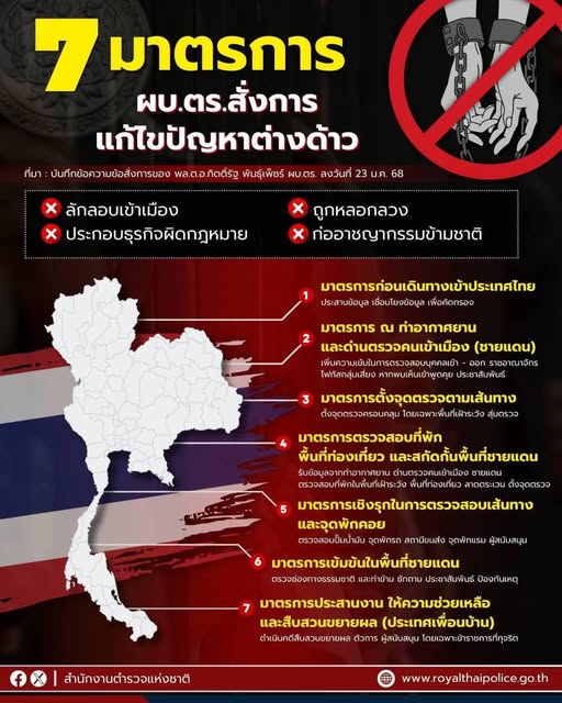 ผบ.ตร.บังคับใช้ 7 มาตรการเข้มข้น แก้ไขปัญหาคนต่างด้าวลักลอบหลบหนีเข้าเมือง ถูกหลอกลวง หรือประกอบธุรกิจผิดกฎหมาย และอาชญากรรมข้ามชาติ ย้ำชัดให้เห็นผลภายใน 7 วัน หากพบเจ้าหน้าที่มีเอี่ยวหรือบกพร่อง ฟันเด็ดขาด . เมื่อวันที่ 25 มกราคม 2568 พล.ต.อ.กิตติ์รัฐ พันธุ์เพ็ชร์ ผู้บัญชาการตำรวจแห่งชาติ ( ผบ.ตร. ) เปิดเผยว่า สำนักงานตำรวจแห่งชาติมุ่งมั่นในการแก้ไขปัญหาคนต่างด้าวที่หลบหนีเข้าเมืองโดยผิดกฎหมาย คนต่างด้าวตั้งกลุ่มแก๊งกระทำความผิดหรือประกอบธุรกิจผิดกฎหมาย และอาชญากรรมข้ามชาติ อย่างเต็มกำลัง เพื่อขจัดปัญหาเหล่านี้ให้หมดไปโดยเร็ว จึงได้มีหนังสือสั่งการเน้นย้ำให้หน่วยปฏิบัติที่เกี่ยวข้อง บังคับใช้ 7 มาตรการ อย่างเข้มงวด ในการป้องกันและแก้ไขปัญหา ได้แก่ . 1. มาตรการก่อนคนต่างด้าวเดินทางเข้าประเทศไทย : ประสาน เชื่อมโยงข้อมูล เพื่อทำการคัดกรองบุคคล 2. มาตรการ ณ ท่าอากาศยาน และด่านตรวจคนเข้าเมือง (ชายแดน) : เพิ่มความเข้มงวดในการตรวจสอบบุคคลเข้า-ออกนอกราชอาณาจักร โฟกัสกลุ่มเสี่ยง หากพบเห็นให้รีบดำเนินการซักถาม และประชาสัมพันธ์ มาตรการติดตั้งกล้อง License Plate และเชื่อมโยงกล้องวงจรปิด (ระบบ AI) ติดตั้งป้ายประชาสัมพันธ์ (แจ้งเตือน) 3. มาตรการตั้งจุดตรวจตามเส้นทาง : ตั้งจุดตรวจครอบคลุม โดยเฉพาะพื้นที่เฝ้าระวัง สุ่มเสี่ยง 4. มาตรการตรวจสอบที่พัก พื้นที่ท่องเที่ยว และสกัดกั้นพื้นที่ชายแดน : ตรวจสอบที่พักคนต่างด้าว แหล่งท่องเที่ยว เน้นการสกัดเคลื่อนย้ายข้ามแดนตามช่องทางธรรมชาติ ท่าข้ามแดนต่าง ๆ 5. มาตรการเชิงรุกในการตรวจสอบเส้นทางและจุดพักคอย : ตรวจสอบปั๊มน้ำมัน จุดพักรถ สถานีขนส่ง จุดพักแรม และ 6. มาตรการเข้มข้นในพื้นที่ชายแดน : ตรวจสอบพื้นที่และเอ็กซเรย์พื้นที่ชายแดนทุกแห่ง ลาดตระเวนช่องทางธรรมชาติ และท่าข้าม พื้นที่จังหวัดชายแดนเข้มข้น 7. มาตรการประสานงาน ให้ความช่วยเหลือ และสืบสวนขยายผล : ดำเนินคดี สืบสวนขยายผลไปถึงตัวการ ผู้สนับสนุน โดยเฉพาะข้าราชการที่ทุจริต . จากการเข้มงวดตามมาตรการดังกล่าว ทำให้มีผลการปฏิบัติตั้งแต่วันที่ 20-24 มกราคม 2568 ดังนี้ ⛔️ ปฏิเสธคนต่างด้าวที่มีความเสี่ยงเข้าประเทศ ณ ท่าอากาศยาน จำนวน 10 ราย ⛔️ปฏิเสธการขออยู่ต่อในพื้นที่ จ.ตาก จำนวน 47 ราย ⛔️จับกุมและปรับกรณีอยู่โดยการอนุญาตสิ้นสุด (Overstay) ในพื้นที่ จ.ตาก 92 ราย แบ่งเป็น ชาวจีน 3 ราย และอินโดนีเซีย 1 ราย , ผู้หลบหนีเข้าเมือง บริเวณริมแม่น้ำเมย เป็นชาวเมียนมา 14 ราย และบริเวณจุดตรวจร่วมห้วยหินฝน อ.แม่สอด จ.ตาก 6 ราย รวม 20 ราย 📍การปฏิบัติในพื้นที่ จ.ตาก ดำเน